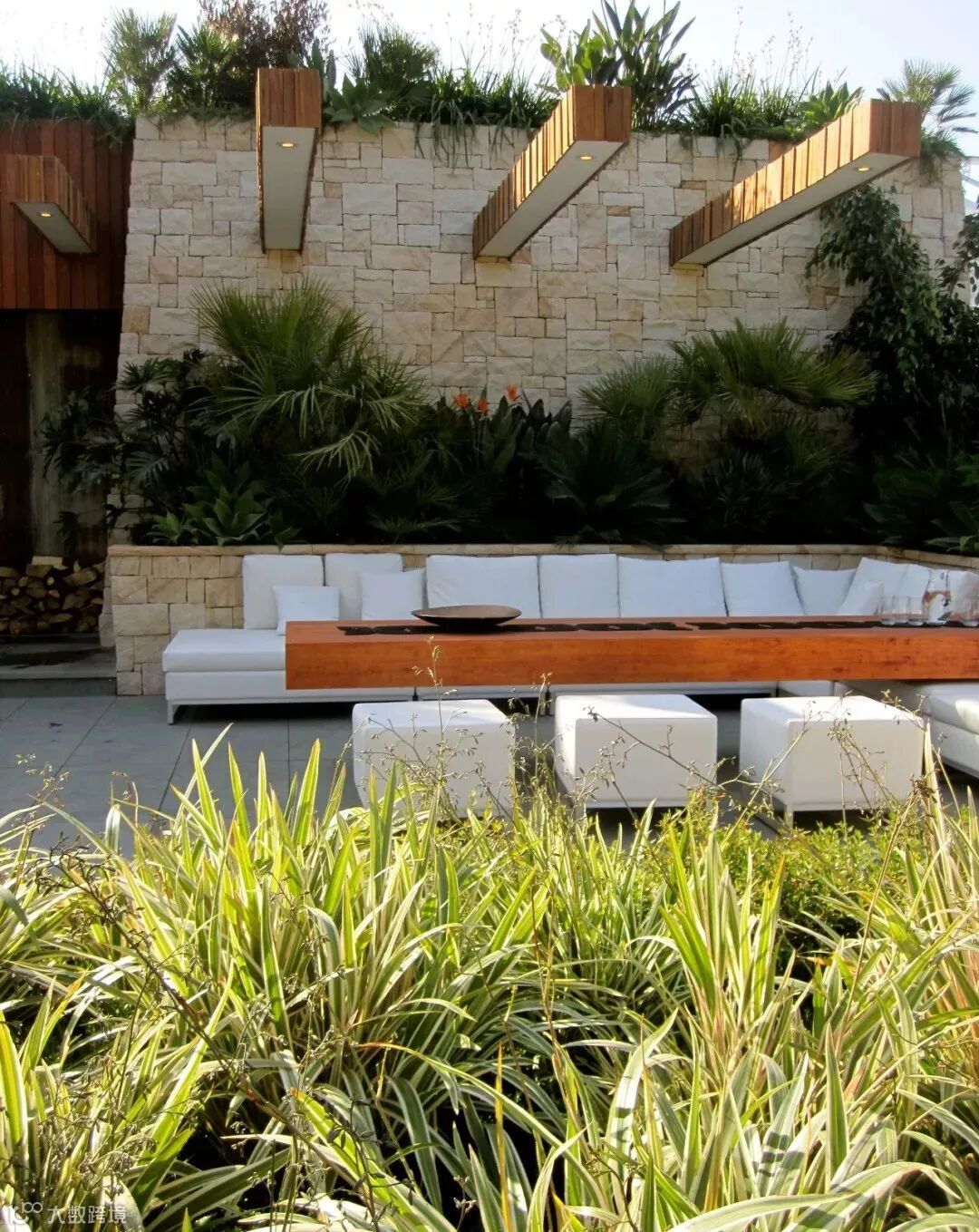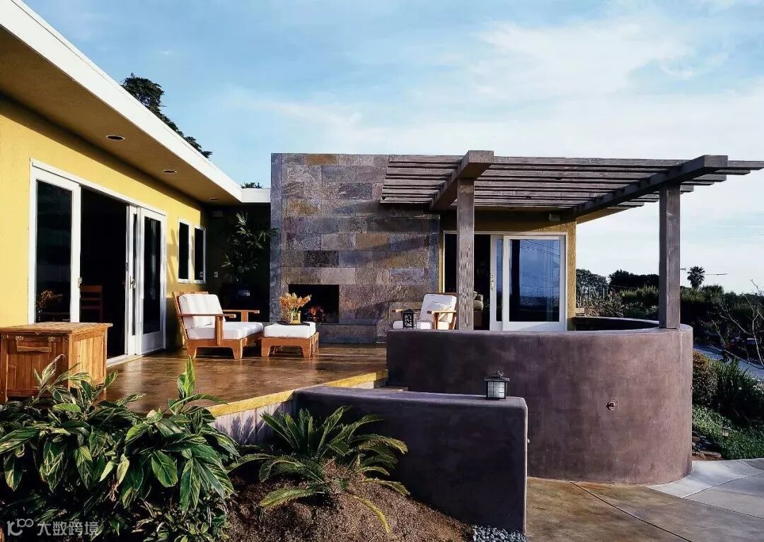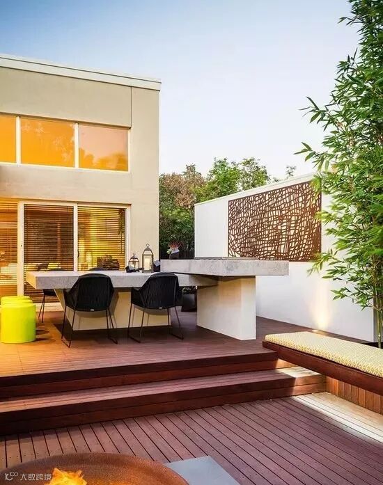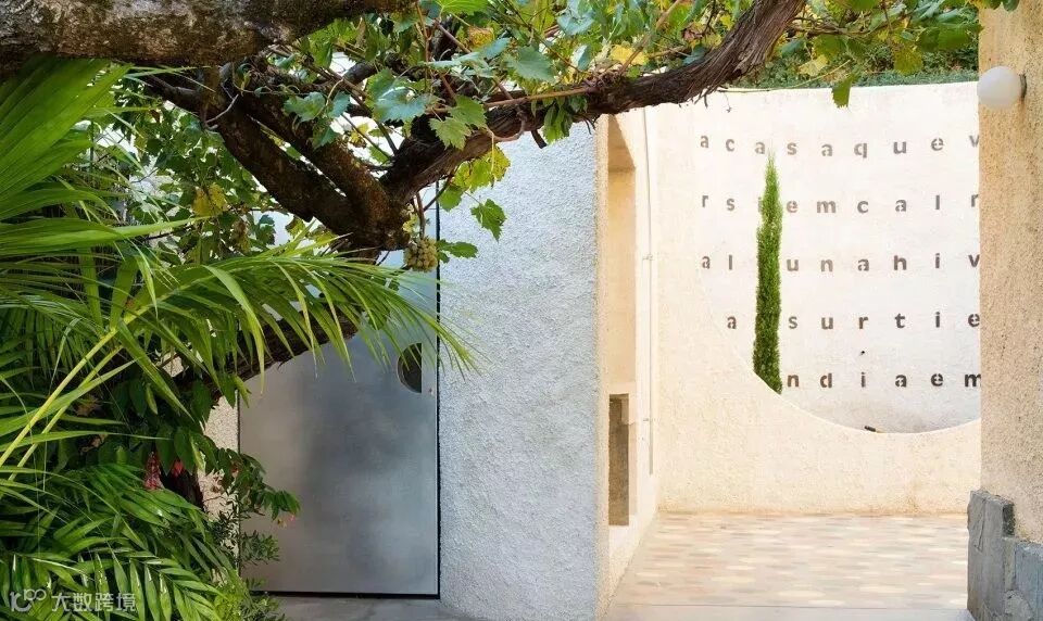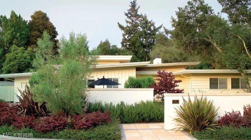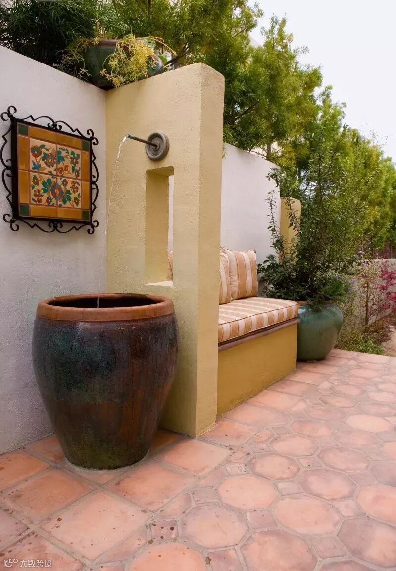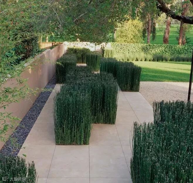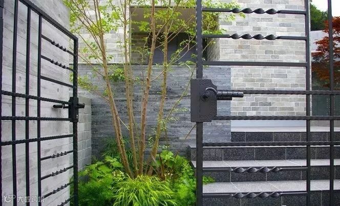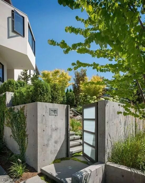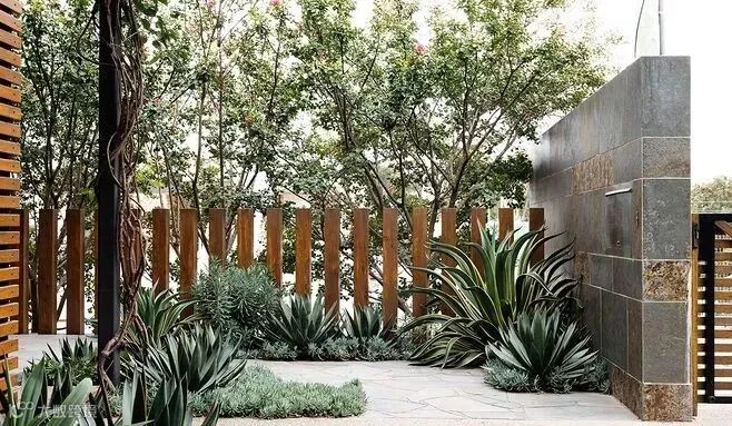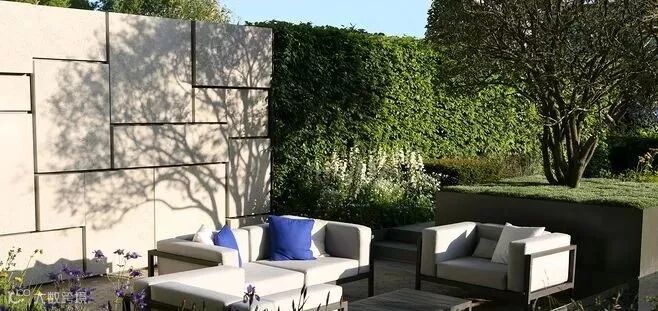 用作遮挡的围墙通常面积比较大,从成本出发,不宜大费周章地去处理,既然是整个花园的背景支撑就让它安安静静地当好一个背景即可,注意选择合适的材料和肌理。恰好位于主要活动区域或者主要视觉落点的围墙可以做一些细节的设计,比如玄关处、休闲区的背景墙。