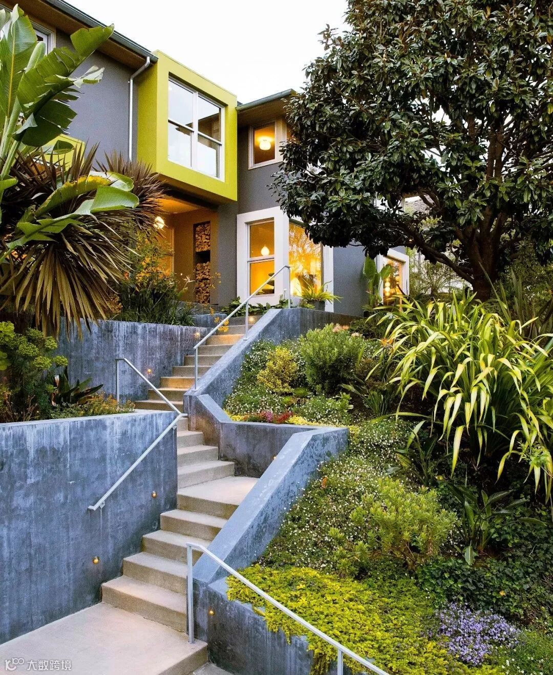 这里只说高差,通常有了高差都是用挡土墙和台阶来处理,但是你大可不必拘泥传统的处理方式,像上图这种折线型起伏的挡土墙就有一种别样的趣味,若你仔细看会发现扶手的走向引导人们避开尖锐的折角,而墙壁上的灯光又保证人们在夜间行走的时候同样有安全保证。