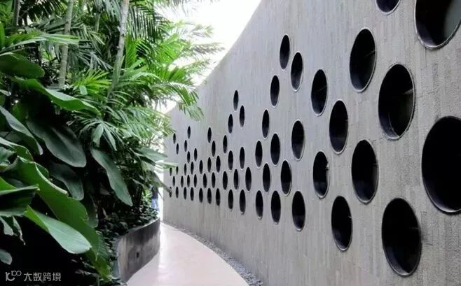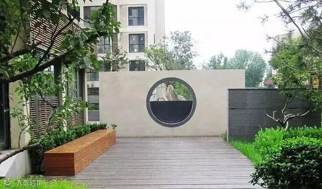 有些地方会有一些专门砌起来的墙体,作区域的分隔用,通常在对应区域的一面可以与整体的设计有一些配合,比如说休闲区的地方可以在景墙的下面加上合适高度的座椅,而如果单纯作为景观使用的墙体可以在立面做一些镂空处理,若圆形,则有画意,若参差,则疏朗有风。