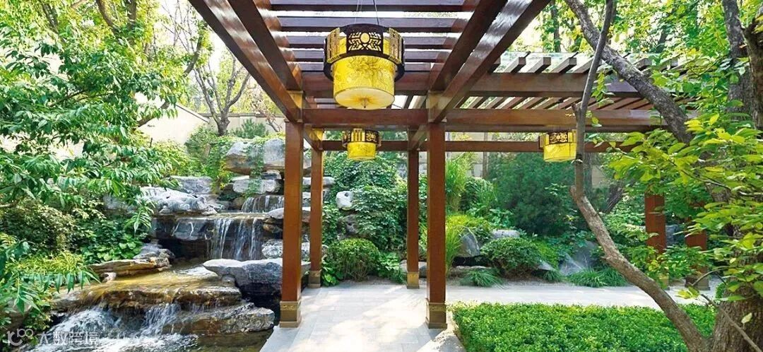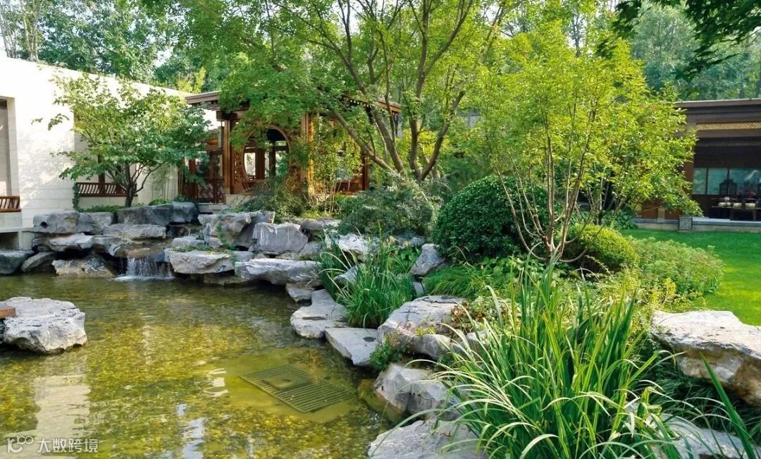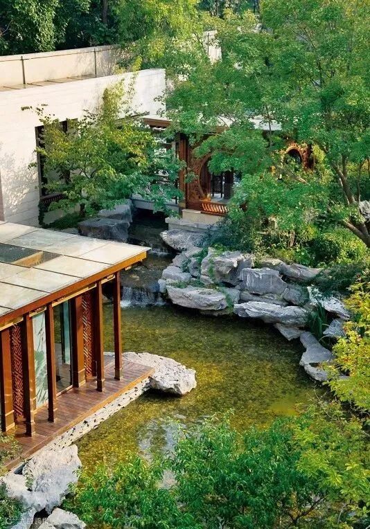 在这个清新淡雅的新中式庭院里就遵循了中国园林讲究的“舒处之去由,察水之来历”,谨遵“虽由人作,宛若天开”的法则:水系无论大小,必曲折有致。将江南园林“聚则通阔,散则萦回”演绎的淋漓尽致。