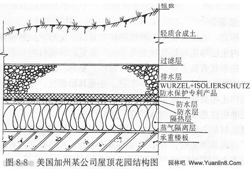 种植区是屋顶花园绿化工程中重要的组成部分,它占地面积大,工作量也大,种植区的构造直接影响屋顶花园的绿化效果,而且关系到绿色植物能否正常生长。种植区一般包括以下几个部分(图8-7、图8-8)。