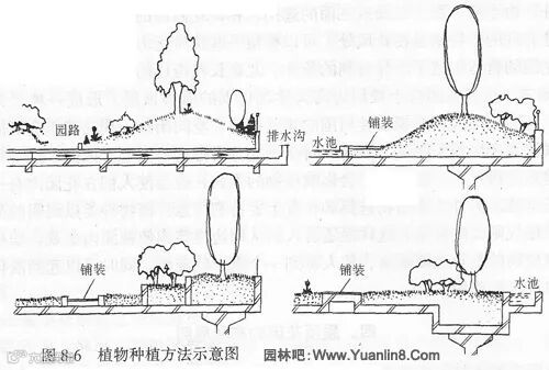 从以上数据可以看出,不同植物对土层厚度有不同的需求,在屋顶花园设计时,对植物种类的选择与数量的确定直接影响其方案能否实现,应注意多选草本和小灌木,而大乔木特别是深根系的要少用甚至不用,只要能起到同样的效果,最好不用深根系乔木。屋顶花园上不同植物种植方法如图8-6。