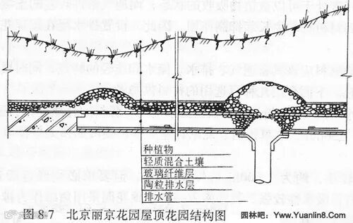 ②种植土层:此层为种植区中最重要的一个组成部分,一般为人工合成的轻质土,不同的植物对土层厚度的要求是有差异的,配制比例可根据各地现有材料的情况而定。