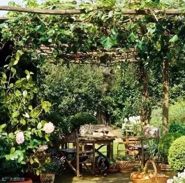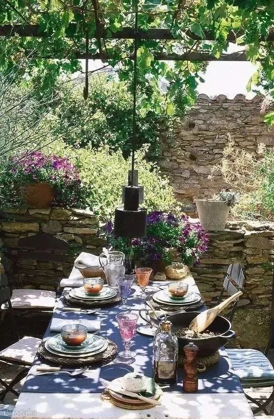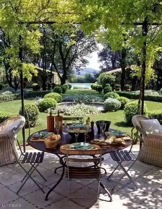 1、花园用餐空间应该按一个房间那样设计,这就意味着设计者要对室外空间的三个面进行设计,以制造一种围合感。