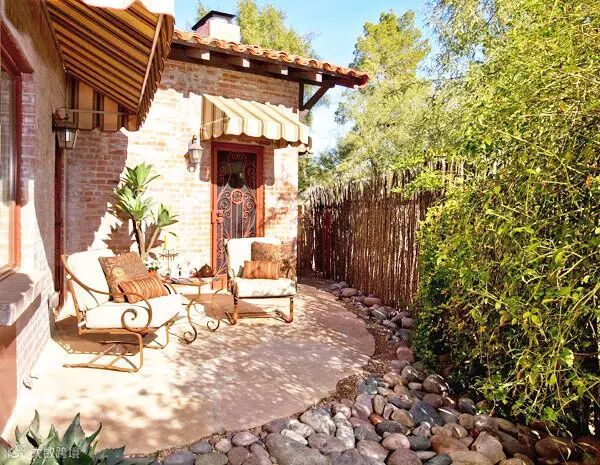 与其整个覆盖,不如只延伸到室外起居和娱乐空间的一部分,顶面也可以在地面上形成迷人的投影,在它的上面还可以悬挂一些盆花、风铃等装饰物。