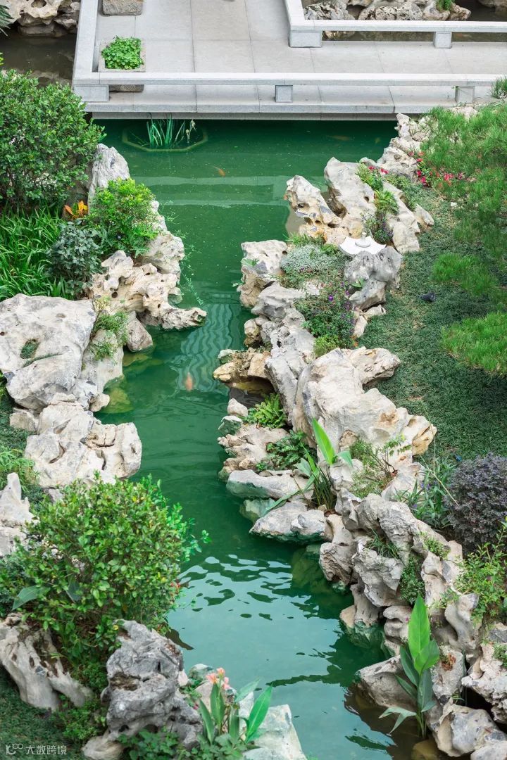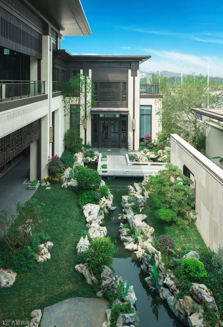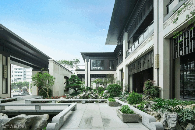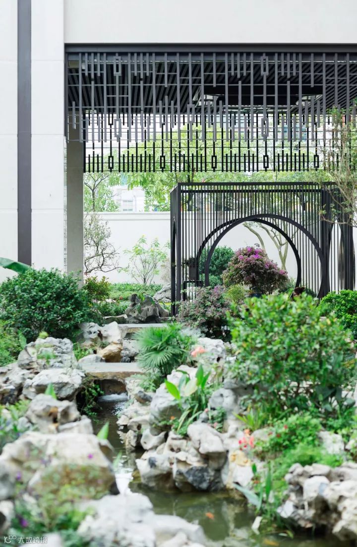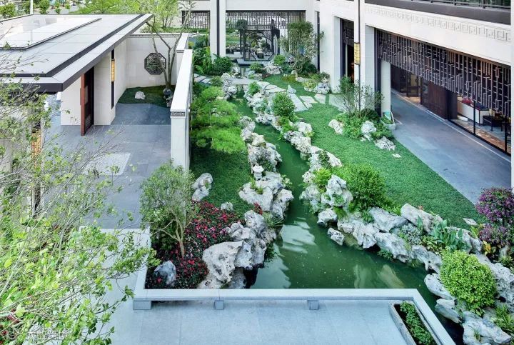 设计在中式园林中延续古典精髓,构设了这个静美的、诗一般的自然灵界。为规避都市熙攘喧嚣,创作团队在整体设计中界定出敞亮的前厅、围合的中庭、及静谧的后院三个核心空间、五个景观区域。整体景观序列呼应建筑及室内空间,昭示出收放有致、交互渗透、虚实结合的景观空间形态。