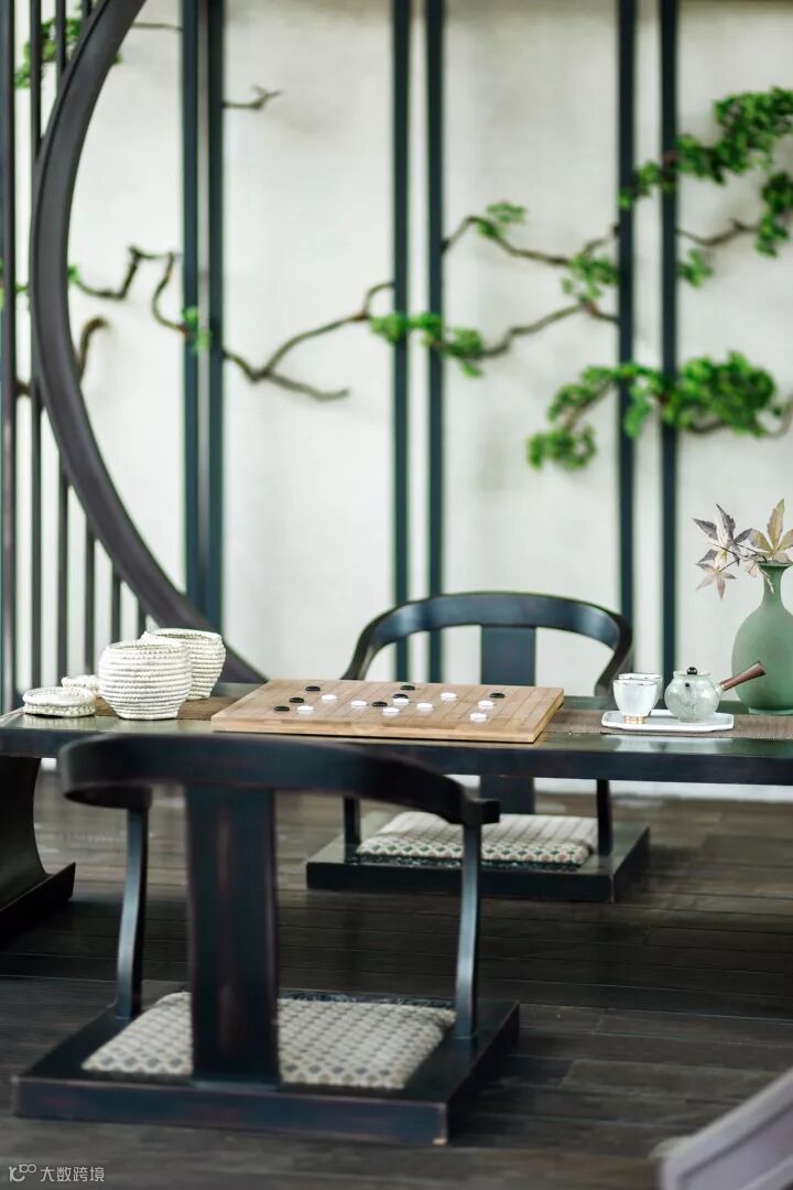 白墙、圆门,静谧安然,沉静点画,由门洞入内,乃竹外一枝轩的所在,斑斑竹影映现在对照墙上,设计通过几竿修竹表达出万顷竹林的景象。瑟瑟风声里,竹径通幽,竹影摇曳,相互渗透,让人感觉清气自来,顿远凡尘襟怀。