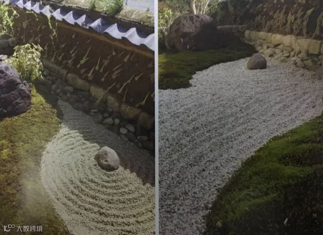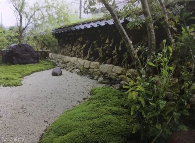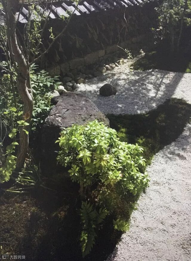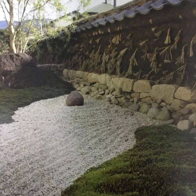 除了泥球墙壁,设计师还在院子里设计了其他的小景。比如在墙壁旁以细沙和石头设计了一副海岛的景象,这也是传统日式中以沙为海,以石为岛。