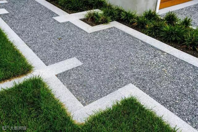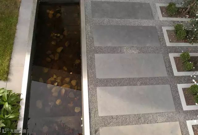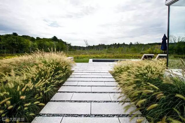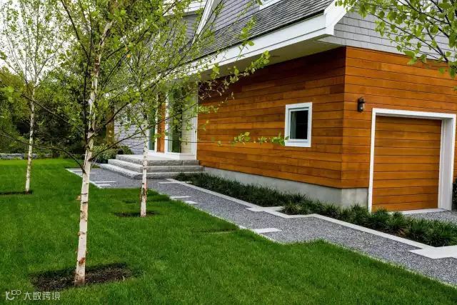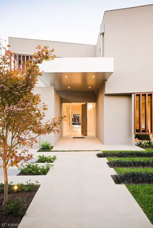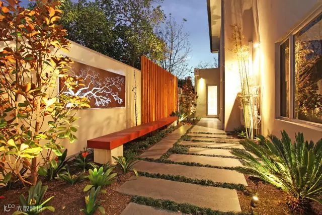 进入庭院是通过一个入口门头,前庭院是一条简洁直接的链接入口的道路,两边嵌这用不锈钢圈着的条形绿化。