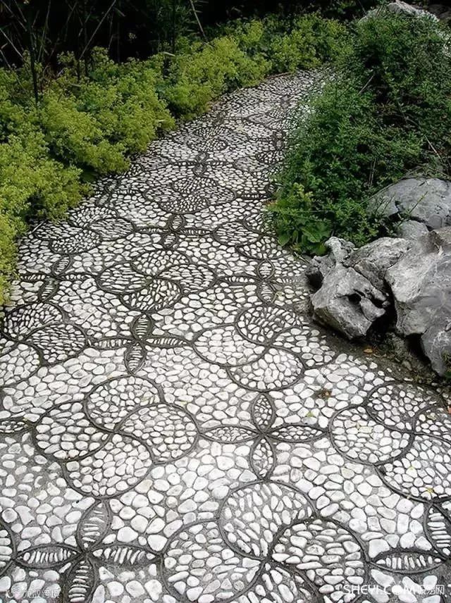 其铺装主要是经过:清理基层、抹底层浆、填充鹅卵石三步