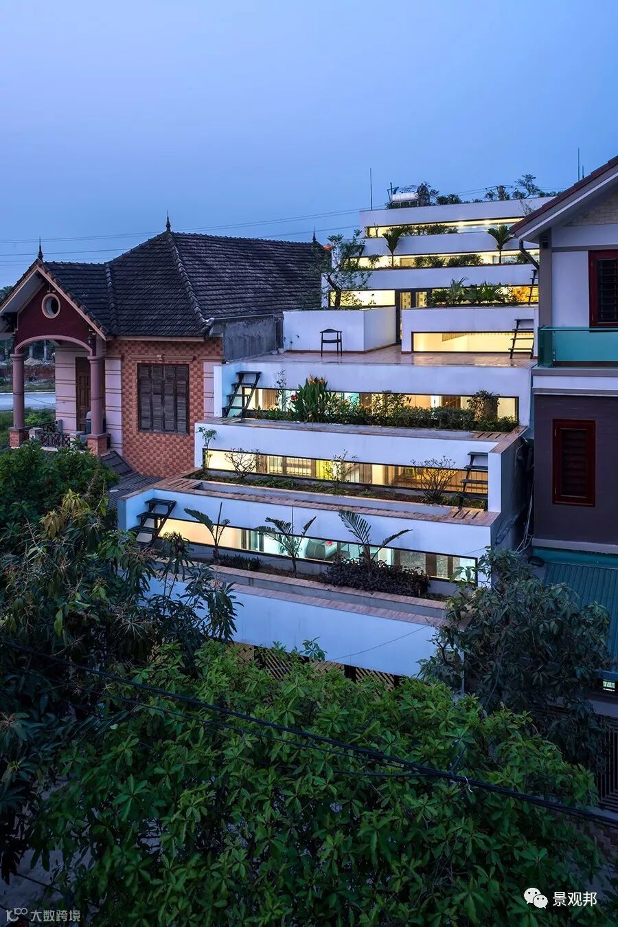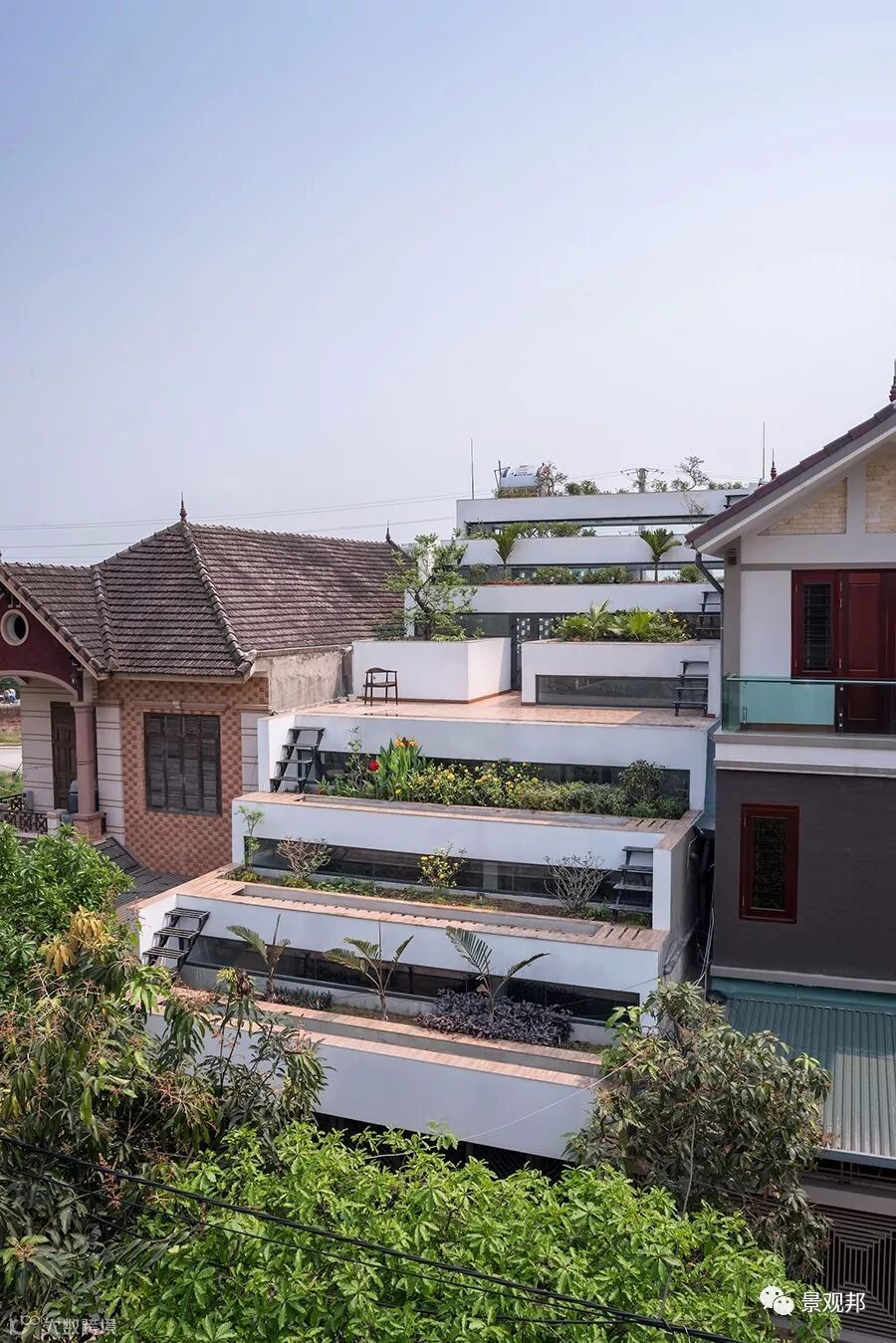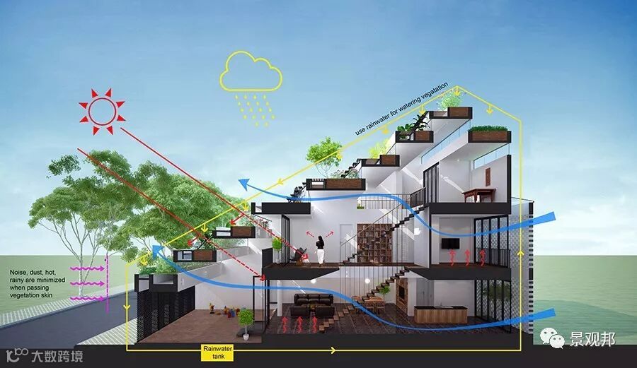 在“梯田之家”(Teraces Home)中,他们将越南乡村生活的两种基本元素结合在了一起:居住需求与农耕传统转化为了水稻梯田造型的阶梯式建筑。热带季风的天气条件由坡顶的两个灌溉系统进行调节,从而让这里草木长青。