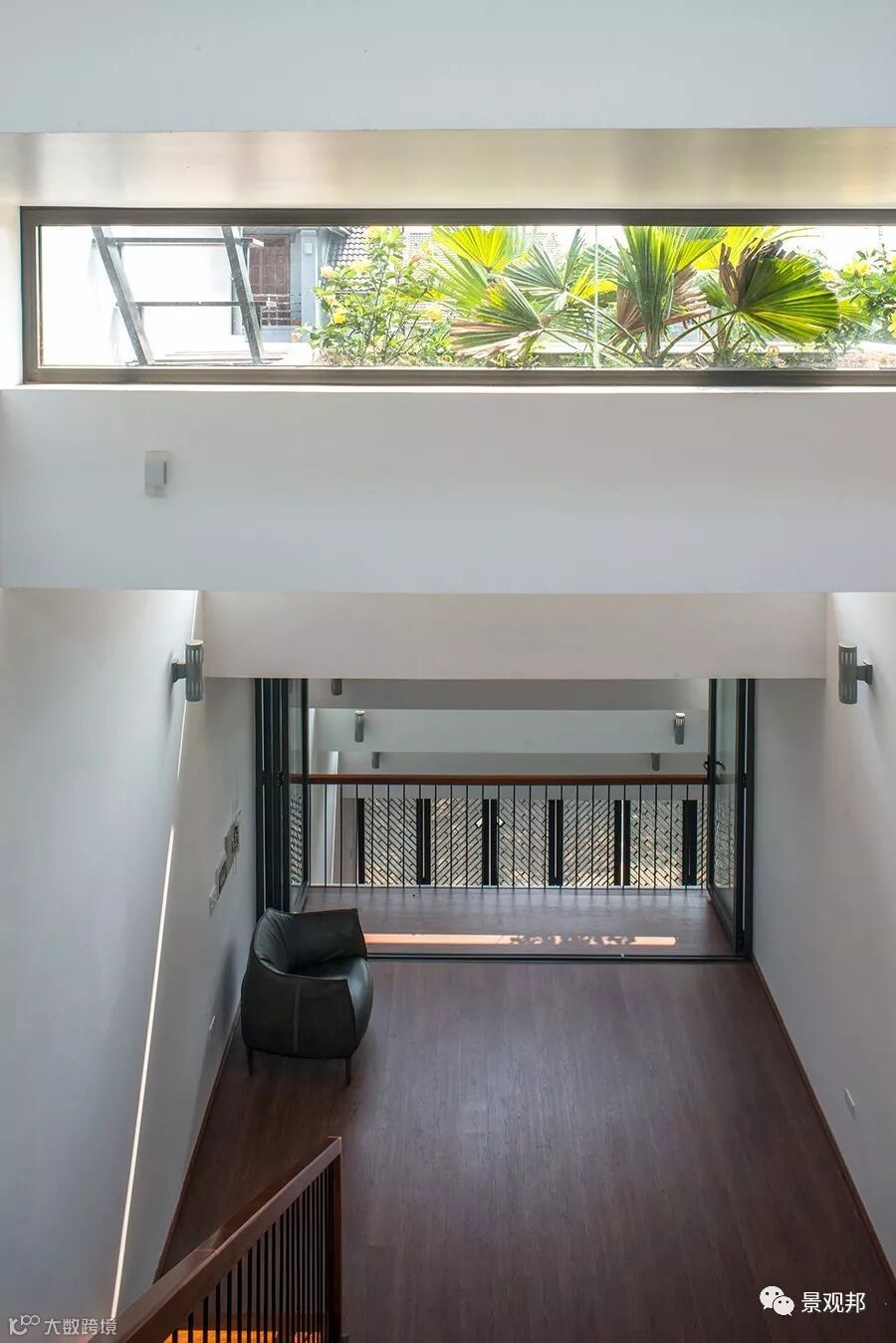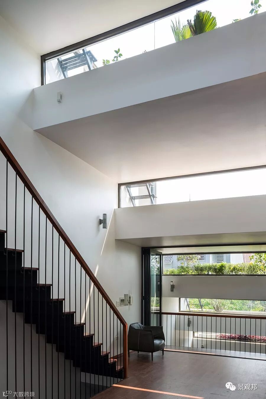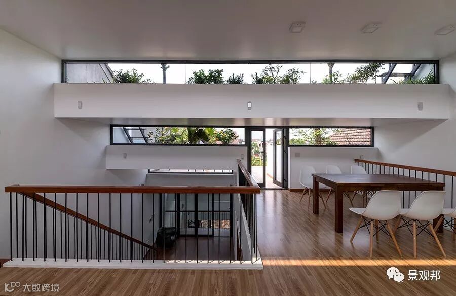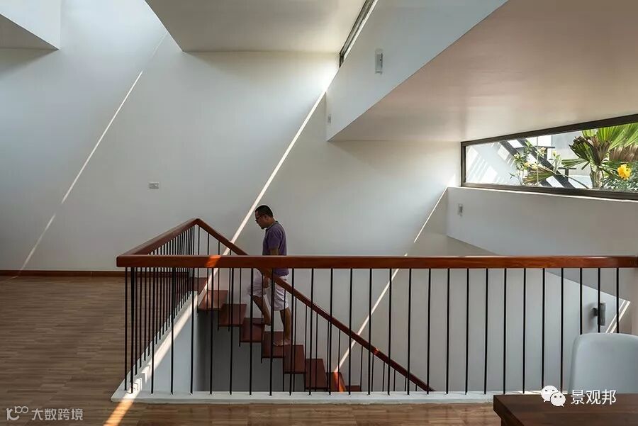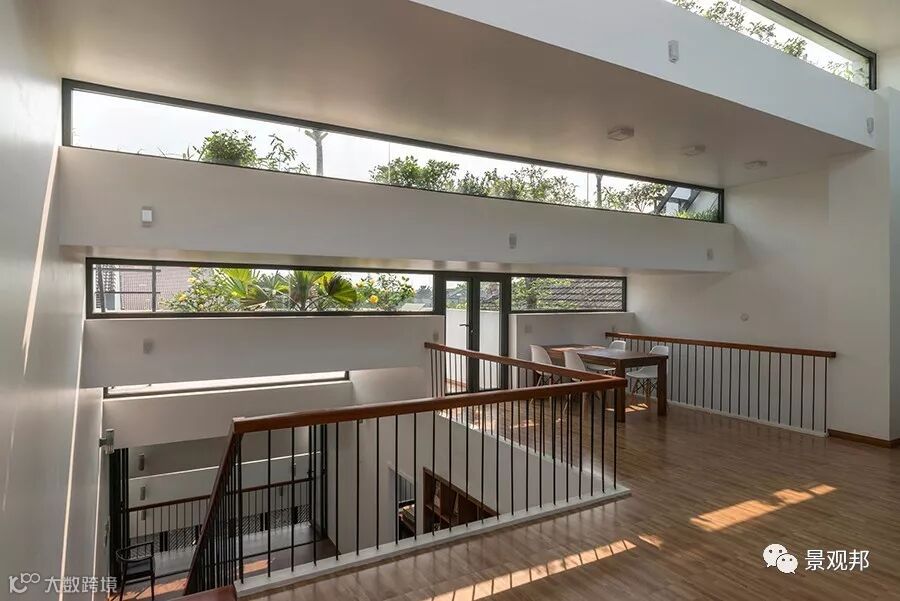 “梯田”高差出开了长条形采光窗户,透过玻璃可看到屋顶的种植、天空;光影照进来,室内外无缝与自然对接。
