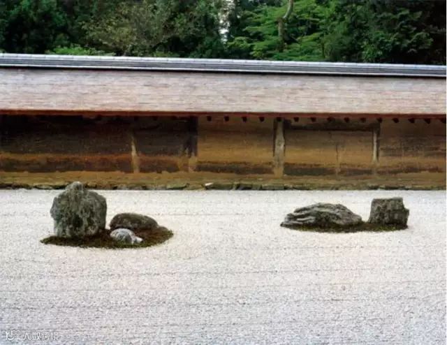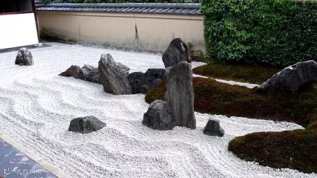 日本园林最为著名即其“枯山水”,以白沙象征水面,以小石象征岛屿,极端抽象体现山水关