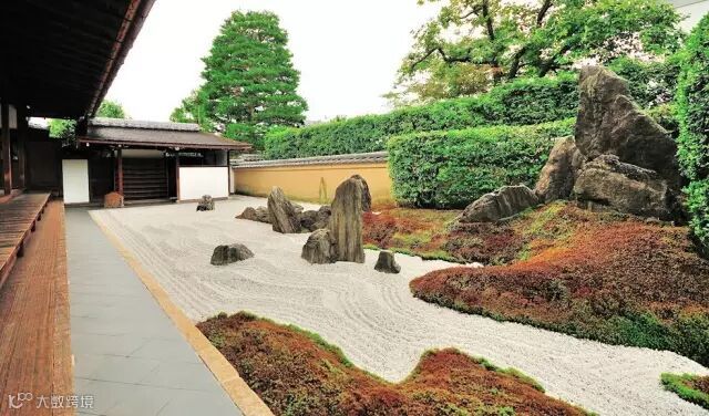 日式园林,善于选用质朴的素材,抽象的手法,表达玄妙道理,以“枯山水”为代表