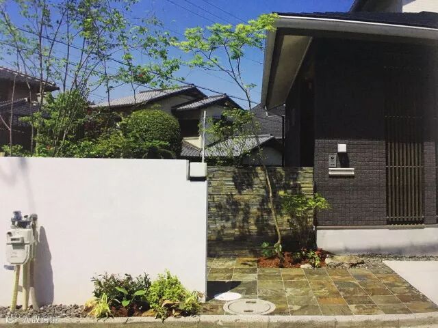 入口处左右两边分别留出恰当的空间以供栽种植物,有纤细的乔木、低矮的灌木,加上植物丛周围随意堆撒的一些砂砾,庭院整体氛围自然而亲切。