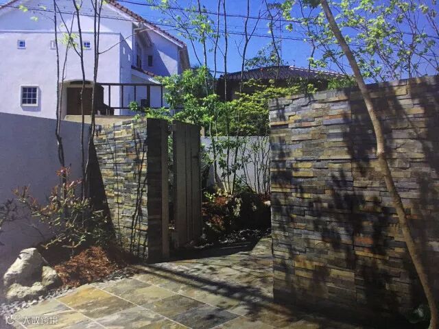 不同颜色的天然石板有序地拼贴,一直通向房子的大门,铺装的石砖因其自然的颜色,与对立面同一色系的石砖围墙形成了色彩上的呼应。