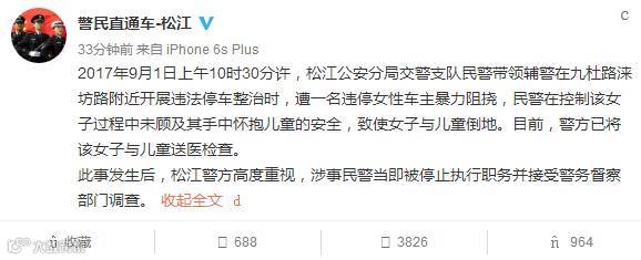 2017年9月1日上午10时30分许,松江公安分局交警支队民警带领辅警在九杜路涞坊路附近开展违法停车整治时,遭一名违停女性车主暴力阻挠,民警在控制该女子过程中未顾及其手中怀抱儿童的安全,致使女子与儿童倒地。目前,警方已将该女子与儿童送医检查。此事发生后,松江警方高度重视,涉事民警当即被停止执行职务并接受警务督察部门调查。