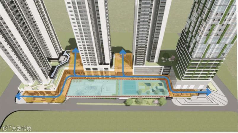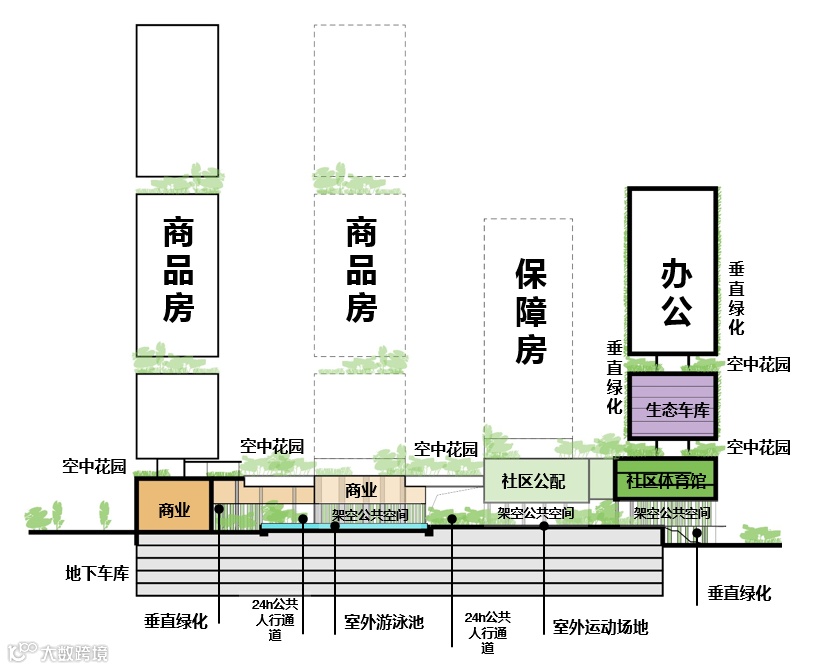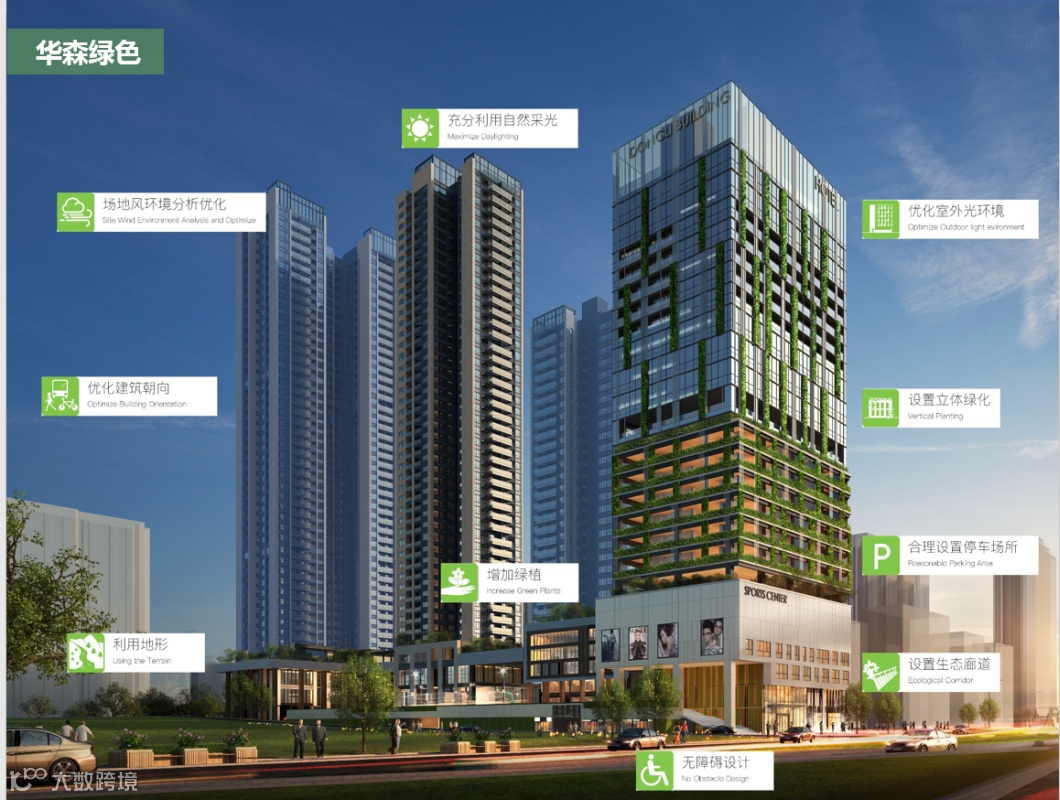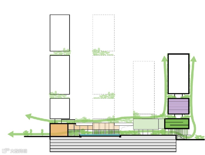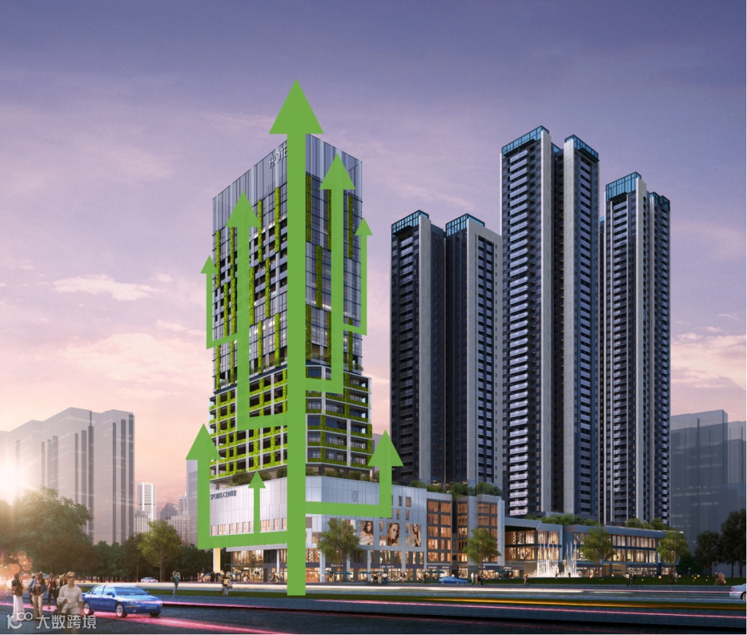 综合楼在高强度的城市开发中,把有限的用地空间集约化,不同功能往垂直方向生长,创造体育上楼、停车上楼、办公上楼、绿色上楼的高效集约化、兼具裙房商业和公配的垂直综合体。