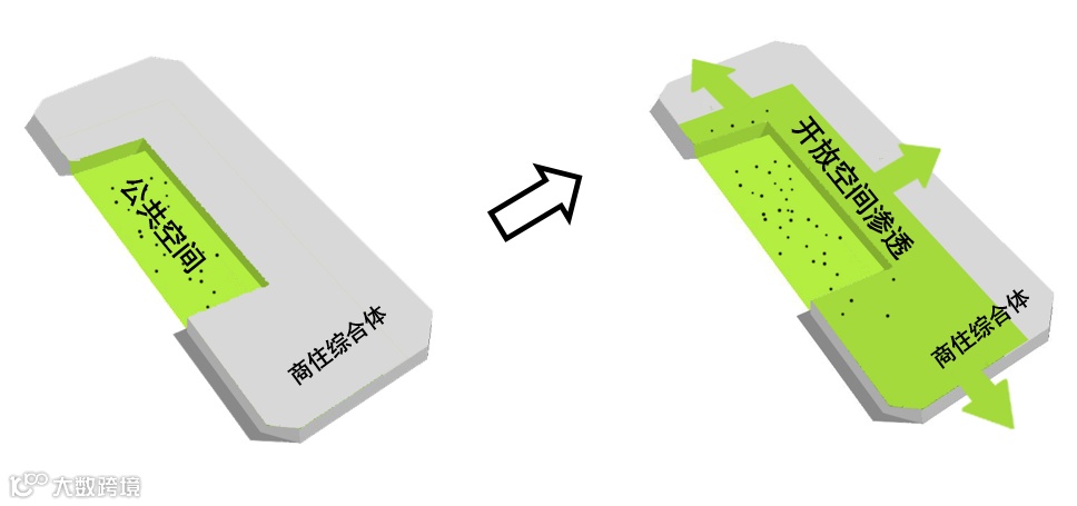 基地内规划建设文体设施用地和商住综合体,为使建设的商住综合体与文体设施用地更好的对话沟通,公共开放空间向外扩张,使空间相互渗透,真正打造出社区体育公园。