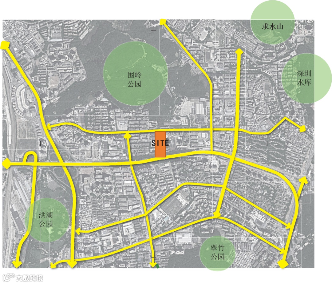 本项目位于深圳市罗湖中北部。基地南侧临城市快速路布心路,东侧临东盛路,北侧临太白路,西侧有规划道路。基地北距交通铁路枢纽深圳东站约3KM,周边有地铁3号线、5号线及7号线经过,地铁线路完善,具有良好的交通通达性。