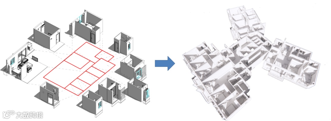 面向装配式建筑设计,单元模块能够以一种模数化的底层数据结构变化,能够适应不同变化的自由组合,从而营造丰富的空间感受以及立面上的细节变化。