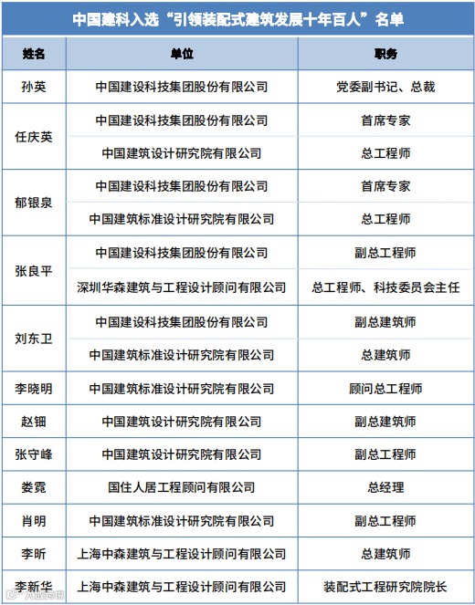 会上,住房和城乡建设部总工程师李如生为“引领装配式建筑十年百人”代表颁发入选证书。中国建科共有12人从200余位候选人中成功入选“引领装配式建筑发展十年百人”,所属中国建筑设计研究院有限公司、中国建筑标准设计研究院有限公司、深圳华森建筑与工程设计顾问有限公司、上海中森建筑设计与工程顾问有限公司四家企业成功入选“装配式建筑领军企业巡礼”。中国建科是个人入选最多、企业入选最多的单位,全面彰显集团引领装配式建筑发展的科技实力。