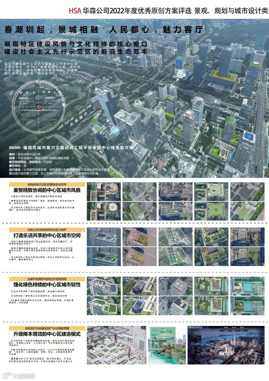 1.本项目的社会价值和意义非常重大。平安金融中心的观光层作为深圳之巅,也是深圳展示城市魅力的窗口和客厅,所以从观光层俯瞰涉及的43栋楼,以其层顶作为目标,通过设计来提升视觉与品质,在全国都是创新之举。