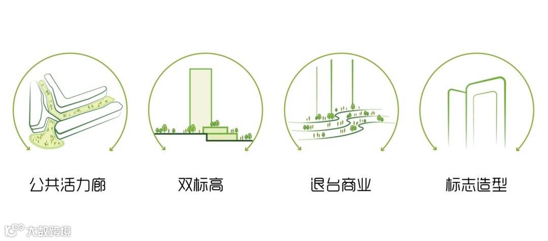 项目用地性质为商业+住宅用地,商业面积占总建筑面积的30%,为最优化街铺商业价值和高层住宅的品质,平衡商业少占用地和高价值的匹配关系,通过沿西、南侧城市道路打造开放式商业街区,街区同时作为连接城市绿地公园、城市路口、小区出入口的公共开放空间,激活片区城市活力。