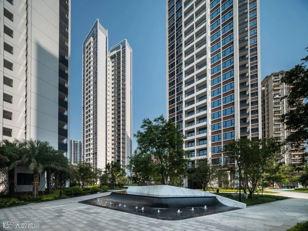 入口设计采用折线递进的入口台阶形式结合温润镜面水景,以一刚一柔的对比,面向归家的居者,深化场地的诗情与温度。
