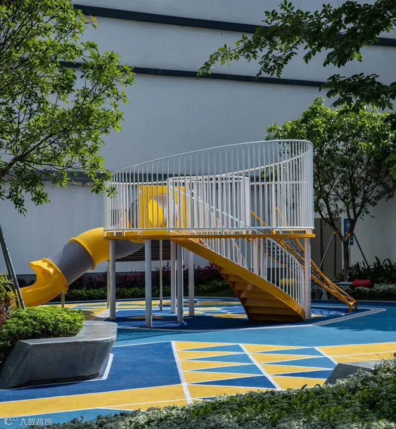 童梦乐园(0-12岁活动区)以活动的折线形式勾勒出色彩缤纷的地面的形式,结合现代趣味的儿童器械提供了一处理想的儿童活动场地。