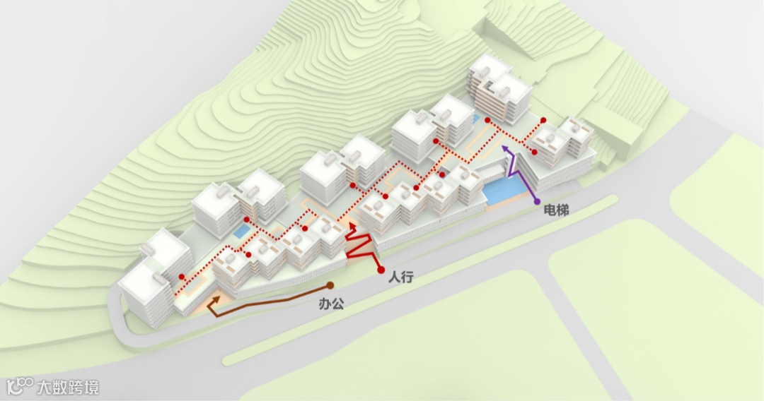 开放式的总图道路规划有助于组织流线设计以及增强各功能之间的灵活通达。