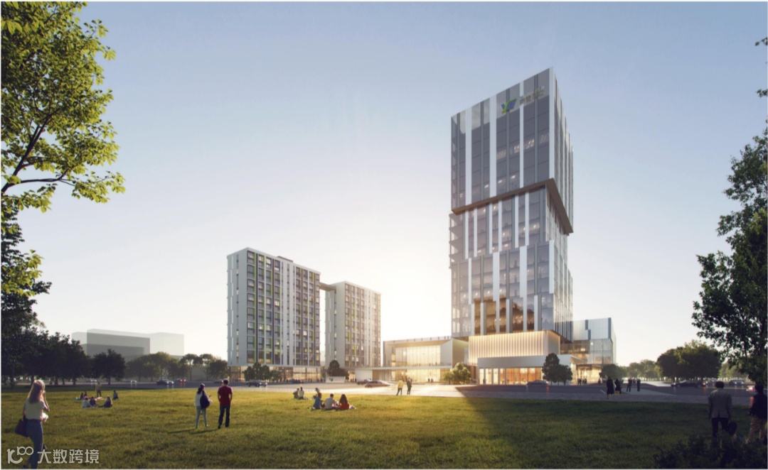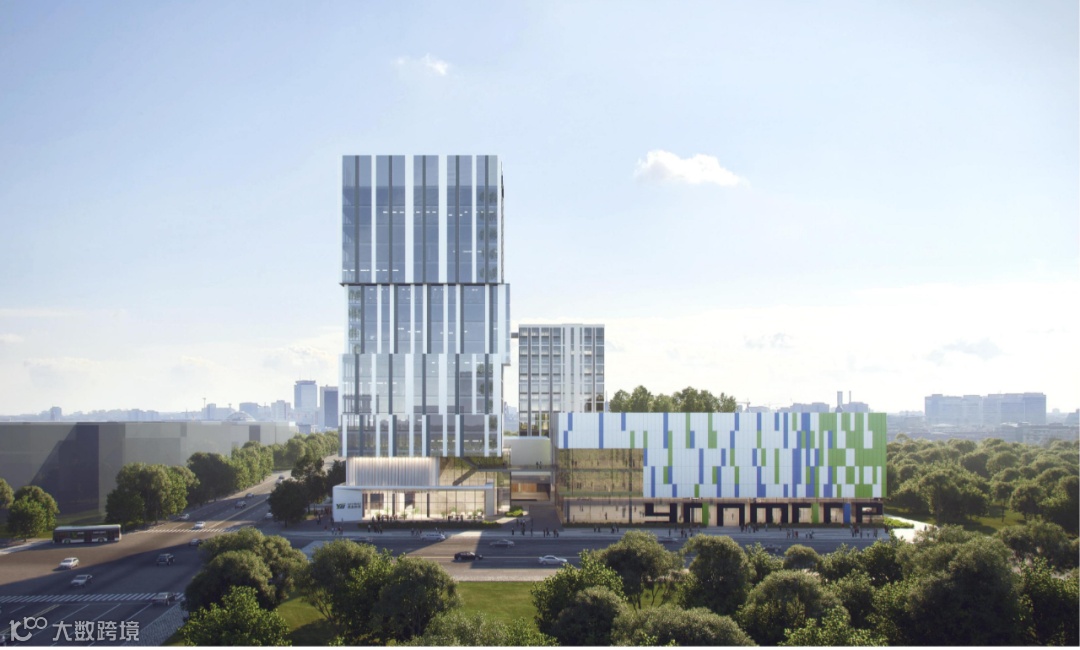 我们希望借此安排给宿舍的公共空间赋予新的身份价值,使其变成最具活力聚集人气的区域,从而提升整个大楼的使用品质。15层的办公大楼面向西北侧主干道,主入口则朝向南面的庭院广场,外立面设计汲取二进制编程语言为灵感,力图呈现有趣且与电脑科技相关的视觉风格。在上层空间设置连廊相互连接以增强办公楼内后勤等相关功能的联系。