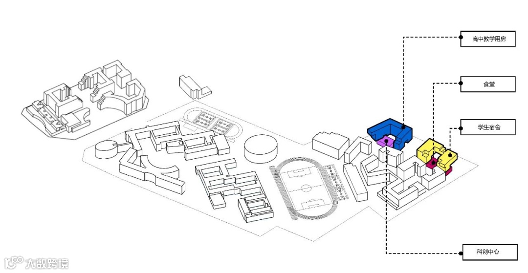 我们的策略是将建筑正负零零标高抬高两层,下方是合班教室、图书馆、食堂等公共功能空间,从南到北设置了一条消防车道,穿过宿舍和教学楼下面的架空层,使消防车能到达主要教学区活动场地,在此平台标高之上设置了六层的教学楼,其中第六层为教师办公室。