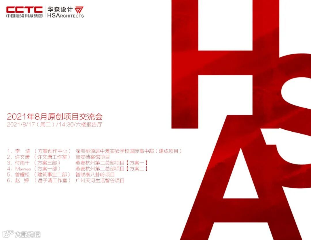8月17日下午,华森公司8月原创项目交流会在深圳举行。公司党委书记、总经理赵林,副总经理、执行总建筑师、方案创作中心总经理肖蓝,总建筑师赵强, 执行总建筑师、方案创作中心创作总监李涟,公司执行总建筑师岳子清、李舒、许文潇等公司技术总、设计部门负责人参加了交流会。李舒总主持了交流会,数十位建筑师参加了分享。会后,主创们对如何持续提升方案创作能力展开了讨论,并对公司三楼工业化内装样板间开放为书吧的方案设想提出了建议。
