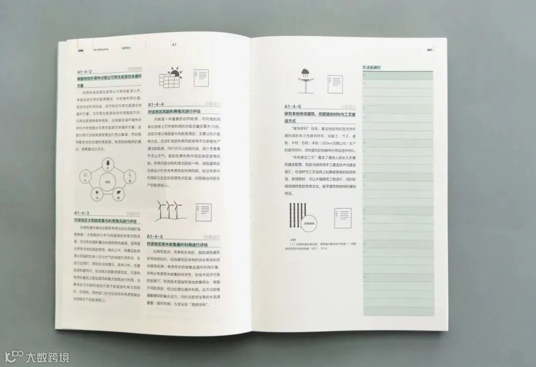 《绿色建筑设计导则》 建筑专业分册依照建筑设计的正向展开时序,先后从场地研究、总体布局、形态生成、空间节能、功能行为、围护界面以及构造材料七个环节引导建筑师进行必要的绿色思考与方法指引,每一章节后均附有方法扩展栏供建筑师自行扩充记录,是一部开放可生长的绿色方法查询记录手册。