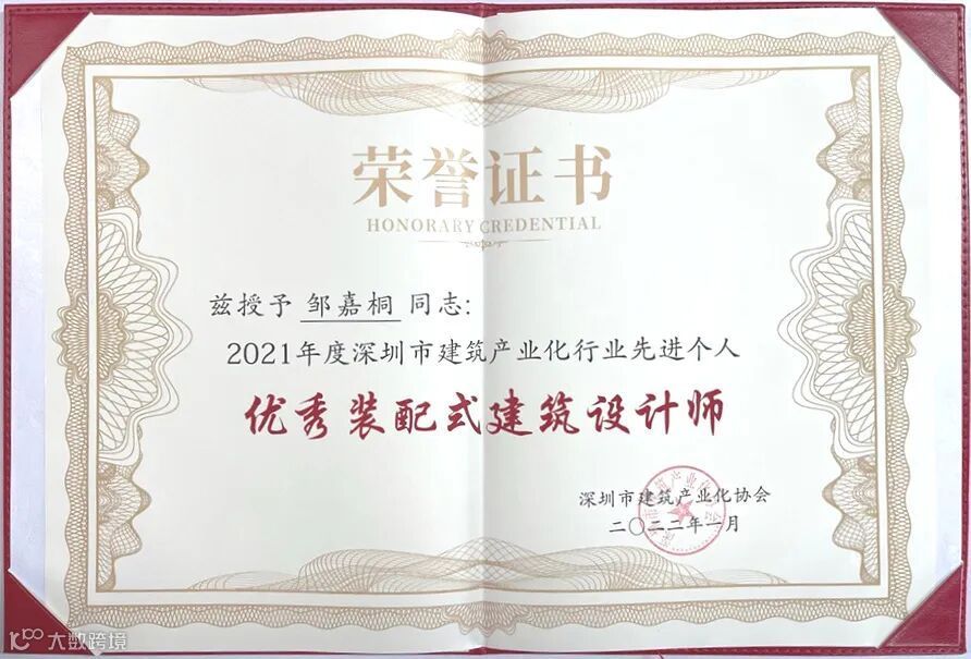 荣获“2021年度深圳市建筑产业化行业先进个人 · 优秀装配式建筑设计师”称号。