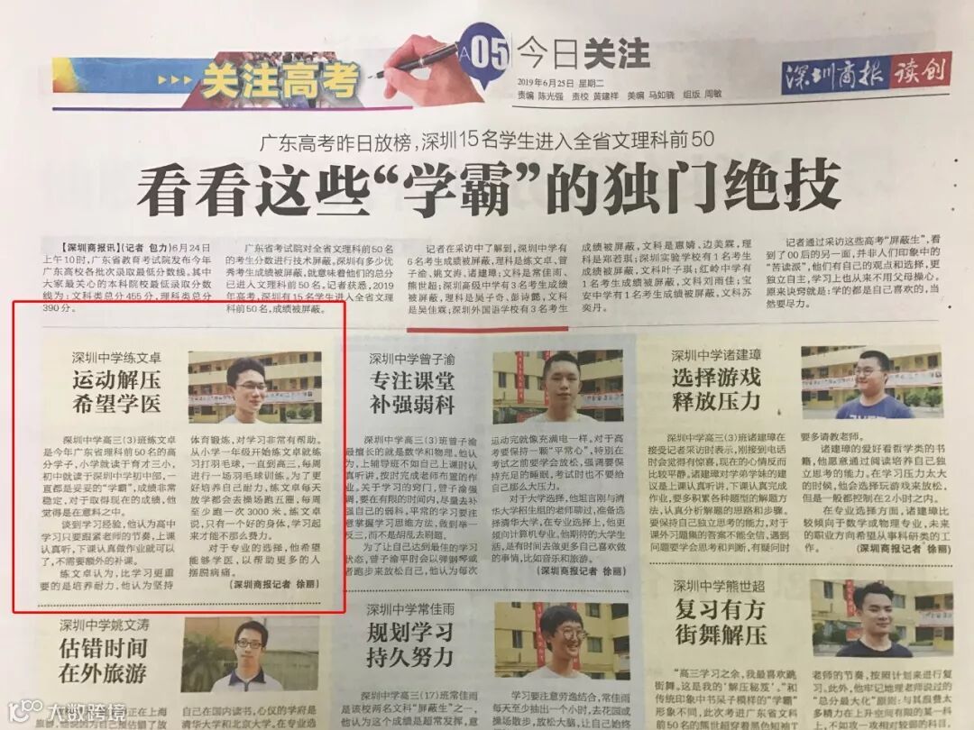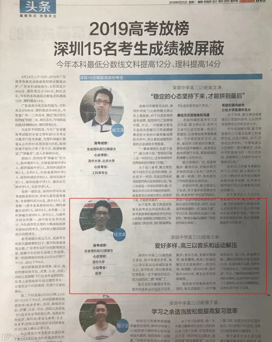 练总:成绩被屏蔽,按照广东省教育局规定,被屏蔽的是进入广东省文理科排名前50的学生。因为他的成绩一直在深圳中学名列前茅,而深圳中学又是深圳顶尖的中学,所以他能取得这样的成绩也是意料之中的事。在高三寒假期间,他就已经被清华大学确定为领军人物并且评定为优秀等级,可以获得30分以上的加分。我们是希望他不用靠加分就可以上清华,最终结果也是如此。虽然等分数的过程有些焦虑,但总体来说是比较淡定的。