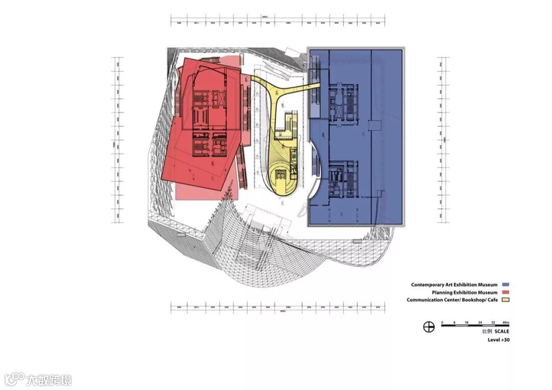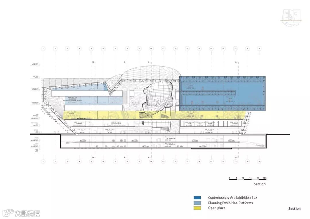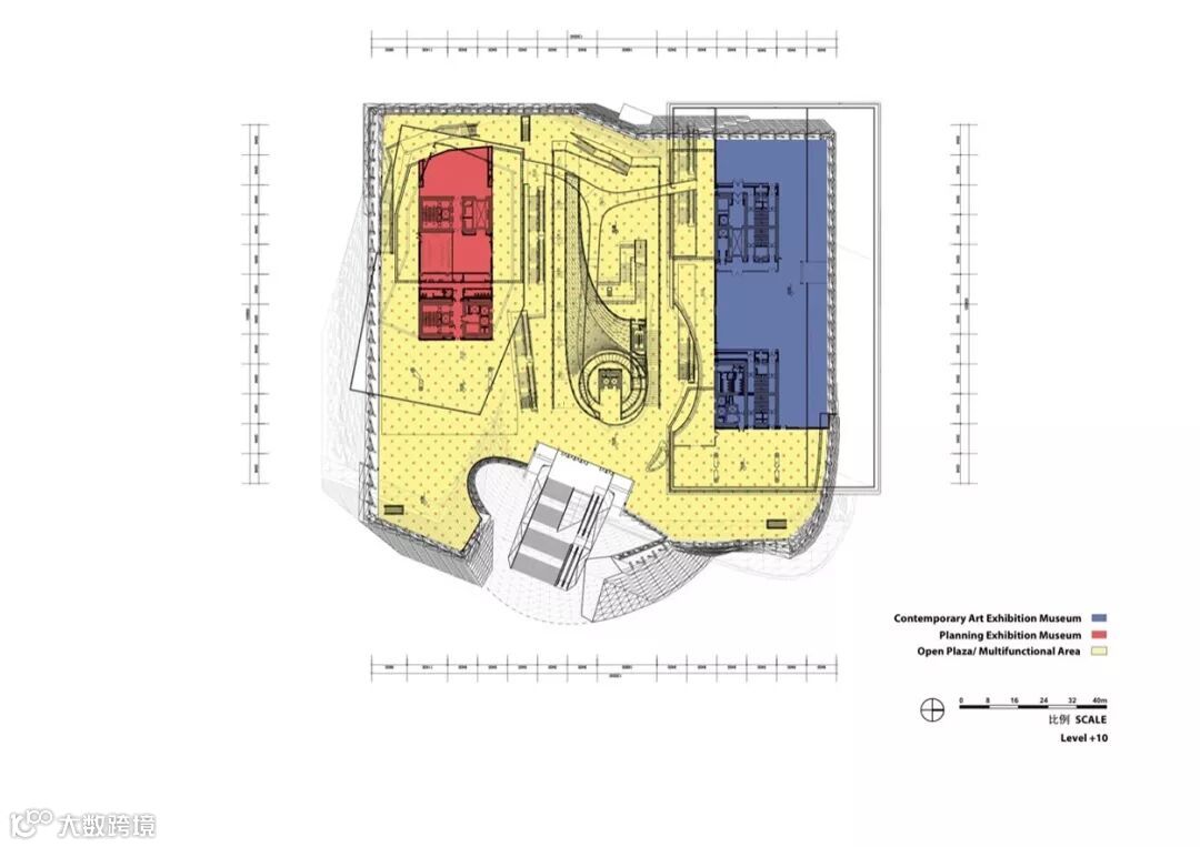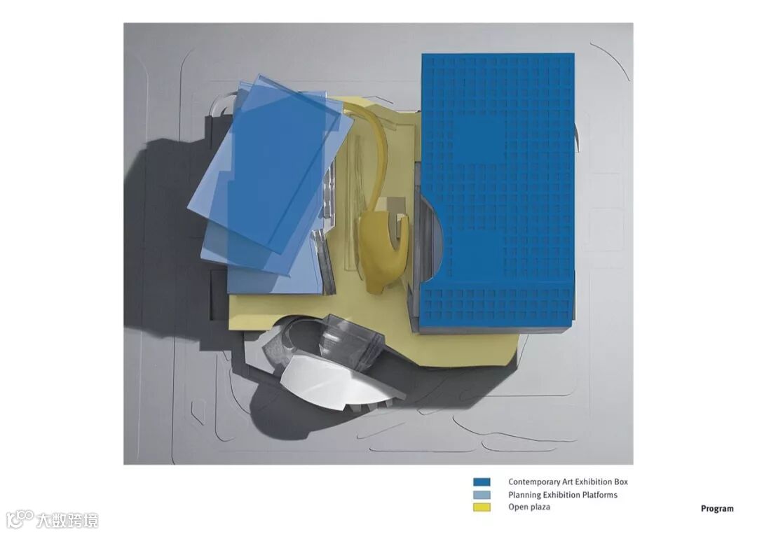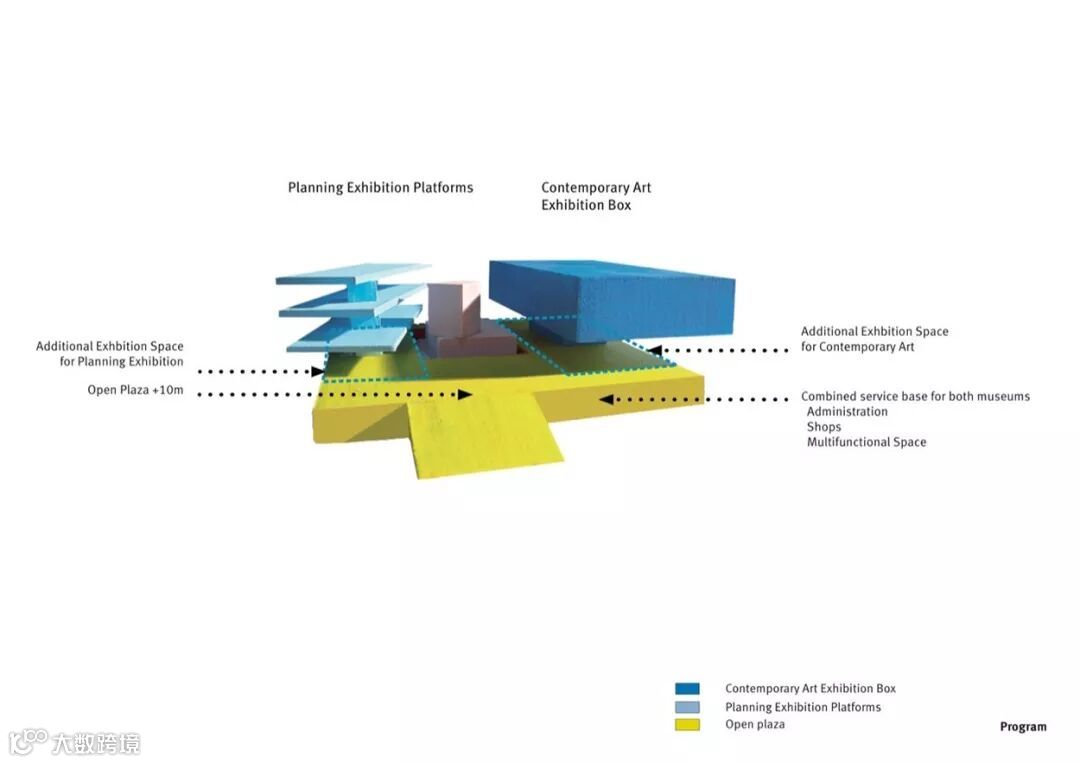 深圳当代艺术与城市规划展览馆完成了城市中心总体规划的东部部分,类比在这个区域的其他建筑物,当代艺术规划展览博物馆的主要平面位于地面以上10米,因此创建一个阶段式的平台,作为一个与相邻的建筑物相对统一的元素。