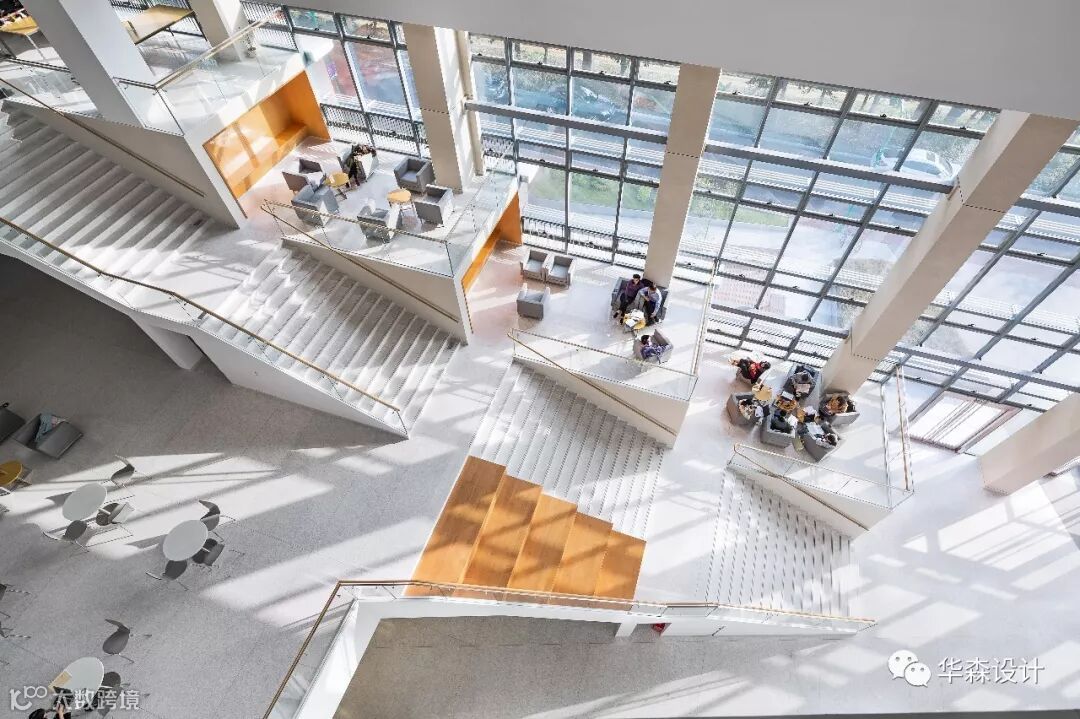 设计将上述功能分为两列,位于中央集会空间两侧。集会空间呈台阶式推进,由此形成三种形态的公共集会空间;开放式首层为大型活动服务,台阶上方是“热闹”的休息和分组活动空间,台阶下方则是“安静”的学习和研究空间。