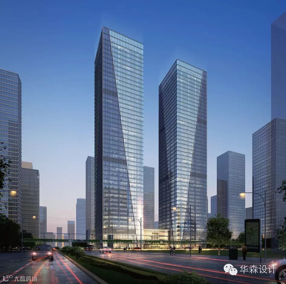 项目位于广东深圳,高度为225米,由2栋211.08米的超高层塔楼,地上3层、地下4层的商业、商务设施和停车场构成。在外形设计上采用对称双塔形象,以简洁形象及对称的方式在建筑群体中脱颖而出。塔楼外立面采用全幕墙的形式,并以一条斜线划分立面竖挺,笔直的竖线条强调建筑的挺拔感,并通过对竖向构件的不同细部处理形成不同的体块结合效果,丰富立面设计。
