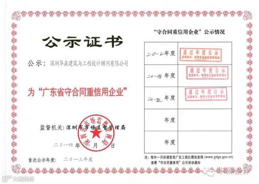 华森设计近日,华森公司获得广东省工商行政管理局颁发的“2013年-2015度广东省守合同重信用企业”荣誉称号。