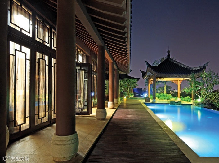 在本项目中,每一间客房都能尽量享受到高尔夫球场、山岭、溪流三种景观中的一种。立面造型采用中式大屋面与现代元素相结合。建筑采用自然石材,凸显帝皇风范。