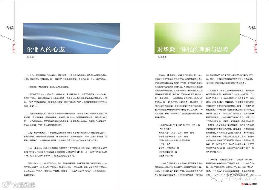 《华森大家》每期80页,沉甸甸的。十年《大家》,从2005年创刊到现在已发行到第38期。十年来,《华森大家》记录华森成长,增进内部交流,弘扬华森品牌,并不断改版创新。