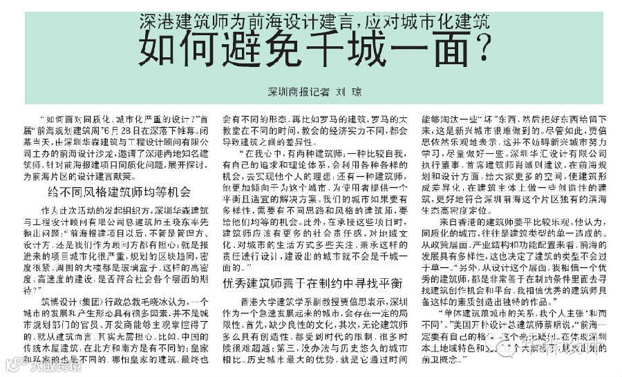 2014年7月2日,《深圳商报》C03版以题为《如何避免千城一面?——深港建筑师为前海设计建言,应对城市化建筑》报道了华森公司主办的前海规划建筑周系列活动之深港合作沙龙。以下为报道全文: