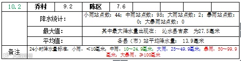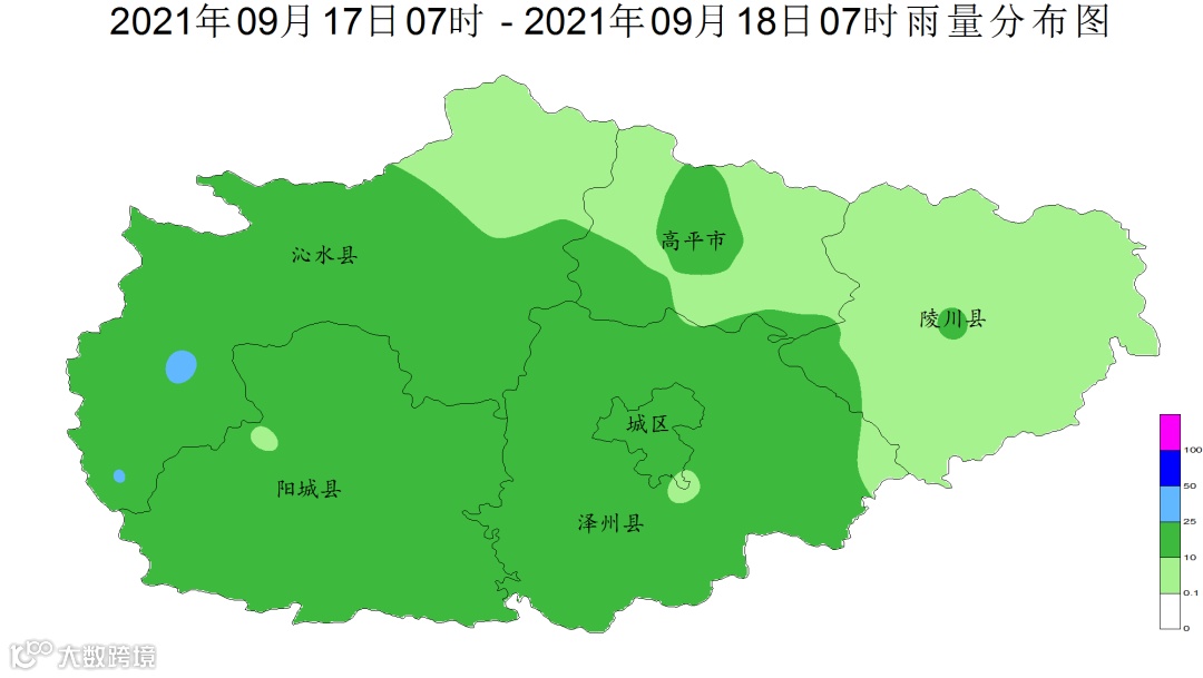 各县(市、区)降水量为:市区:16.6mm;泽州:13.1mm;高平:10.2mm;阳城:16.5mm;沁水: 20.7mm;陵川:6.2mm。