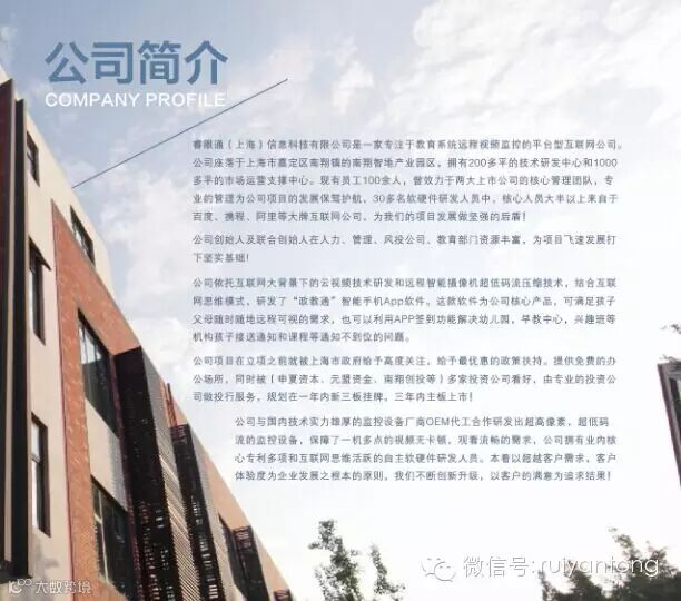 我们睿眼通(上海)信息科技有限公司是一家专注于教育系统可视化的平台型互联网公司。公司座落于上海市嘉定区南翔镇的南翔智地产业园区,拥有200多平的技术研发中心和1000多平的市场运营支撑中心。