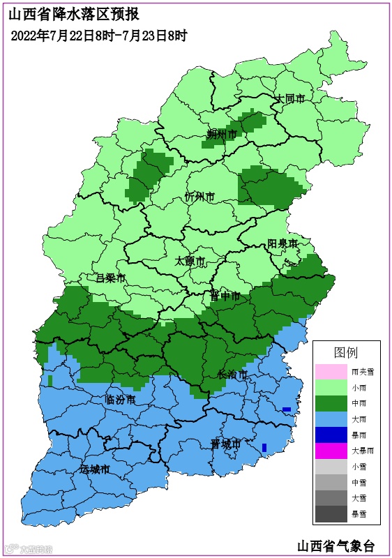 预计22日全市阴天有大雨,阳城南部、泽州南部和陵川东部有大到暴雨,伴有短时强降水、雷暴大风等强对流天气。