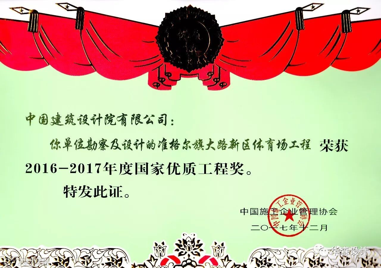 12月13日,2016-2017年度国家优质工程奖总结表彰大会在人民大会堂召开。由中旭公司负责设计的准格尔旗大路新区体育场工程荣获国家优质工程奖。