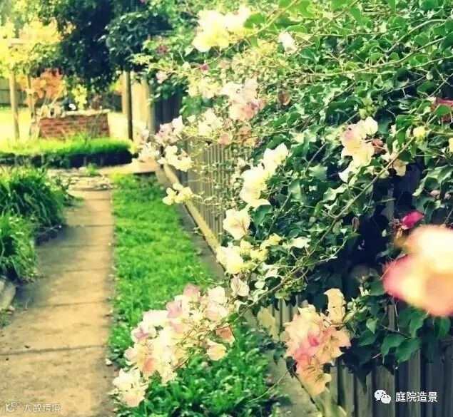 17、最简单的做法就是铁围栏+适合围栏的花,比如蔷薇、牵牛、常春藤、紫藤、金银花等。