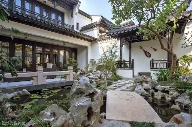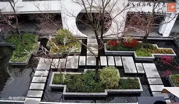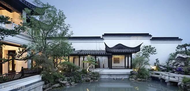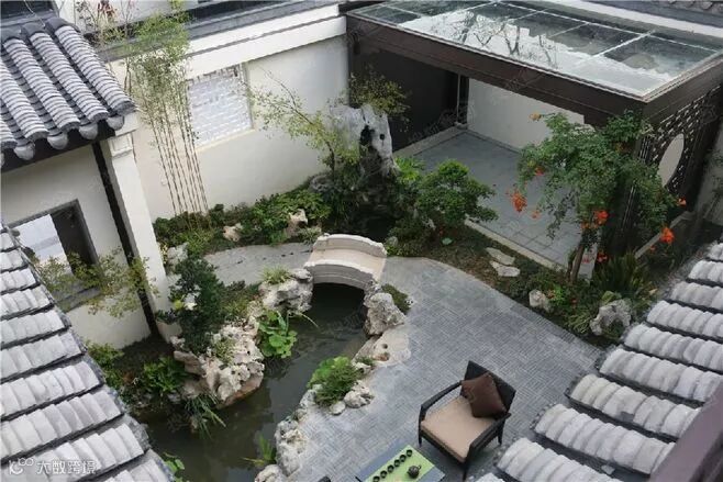 新中式庭院造景方式上遵从固定园林的规则: